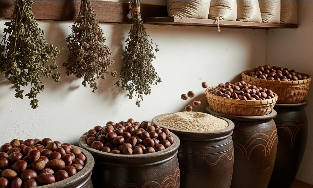 용기 바닥에 굵은 소금을 1cm 정도 두께로 깔아 제습층을 만듭니다. 이 층이 벌레와 곰팡이의 접근을 막는 1차 방어선입니다. - 3단계: 밤과 소금을 층층이 쌓기