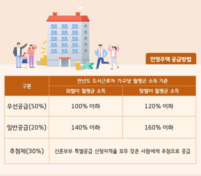 - 다만 공공주택과 민영주택은 소득 기준에 약간 차이가 있으므로 반드시 해당 청약 공고를 확인해야 합니다.