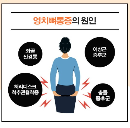 결국 엉치 부근 근육이 뭉치며 통증을 유발하게 됩니다.