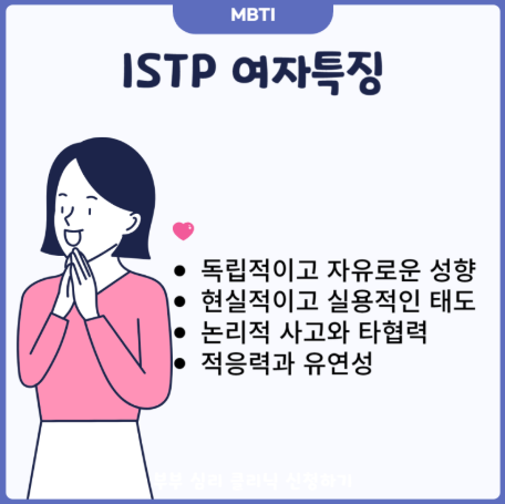 ISTP는 MBTI에서 ‘장인형’으로 불리며, 분석적이고 실용적인 사고를 바탕으로 문제 해결에 능숙한 유형입니다. 자유와 독립성을 중요시하며, 반복적인 환경보다 변화를 수용하는 삶에서 성취감을 느낍니다. 또한 ISTP는 내향적이지만 새로운 경험에는 개방적이며, 문제 해결에 있어서 감각적 직관을 바탕으로 현실적인 해결책을 제시하는 강점을 가지고 있습니다.